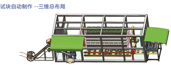 功能介绍:混凝土测压实验室分为:进料区、灌浆区、振浆+抹平+清洗区、脱模区、浸油区、加纸区、喷码区、控制柜、静置区、出库区、高压水气区、码垛区。